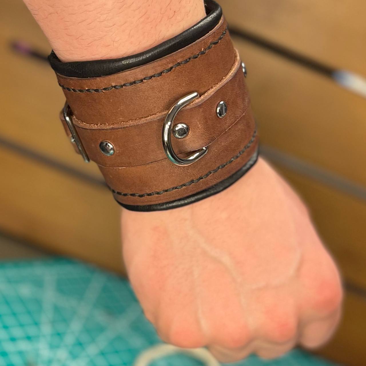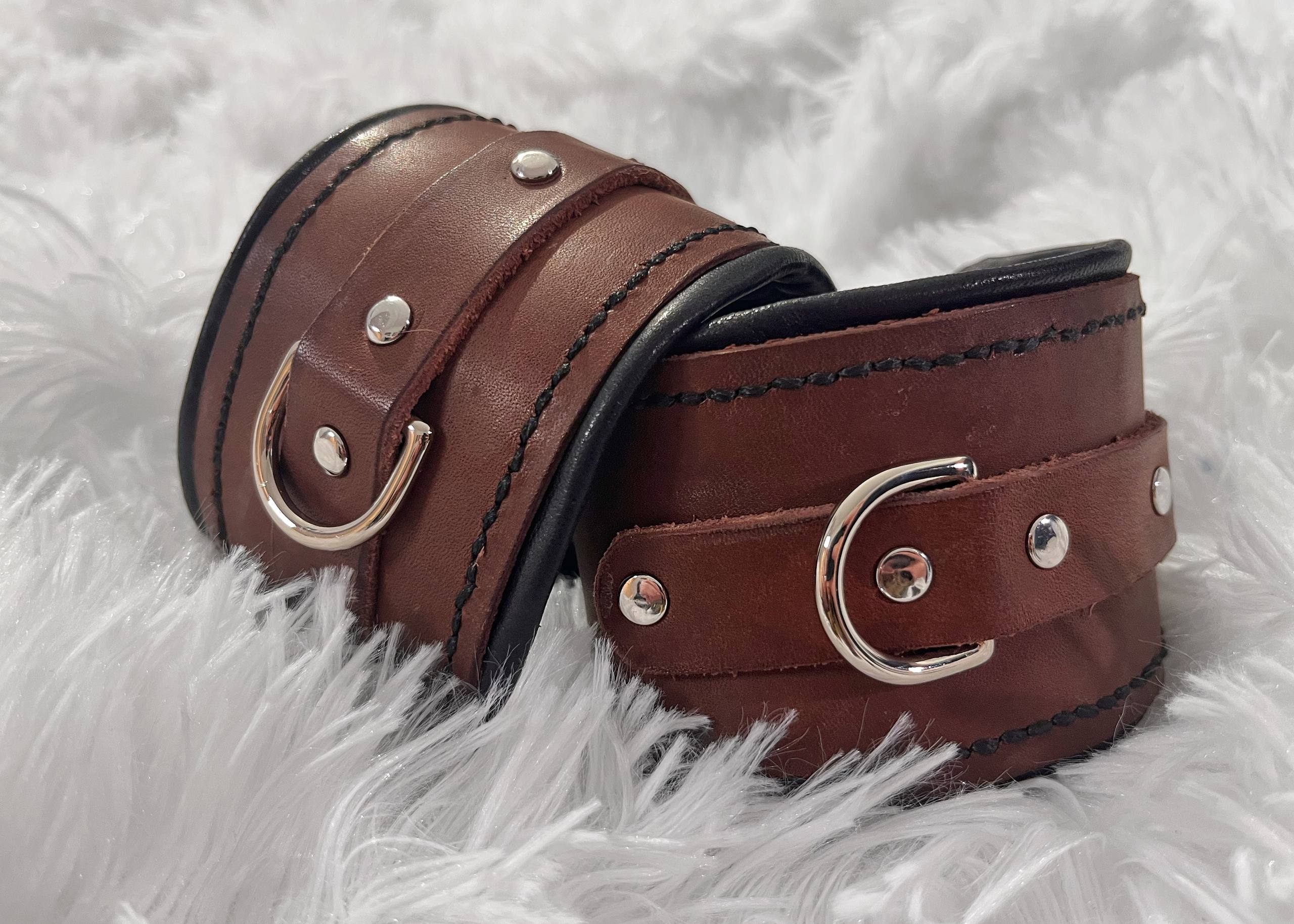 A pair of custom made double strap wrist restraints with cushioned lining.